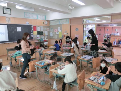 1時間目が2年と5年、2時間目が1年と6年、3時間目が3年と4年でペアを組み、お互いの作品を見合う活動をしました。