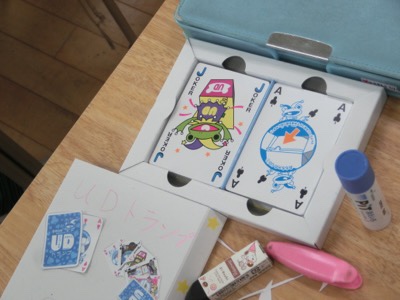 おもちゃメーカーの方が来てくださって、ユニバーサルデザインのトランプを教材にして考えました。
