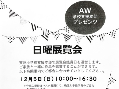 学校行事としての展覧会は、金曜日と土曜日で終了です。片付けは月曜日なので日曜日は展示が残ったまま。でも、日曜日に教員はいないので、本来は閉めたままになります。運営を学校支援本部(AW)がしてくださることで、オープンできることになったのが「日曜展覧会」です。