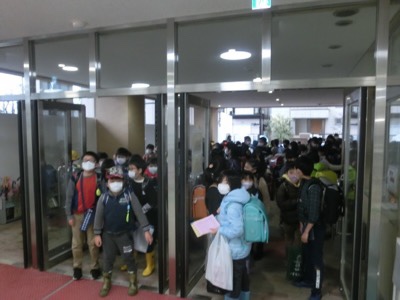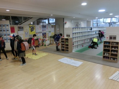 エントランスに入ったところに、用務業務のリンレイさんが大きなタオルを敷いてくれています。靴下まで濡れてしまった子が足を拭いたり、ランドセルから滴る水を吸ったりしてくれるので、エントランスがあまり濡れないようになっています。