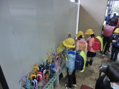 1年生は、さしてきた傘をたたんで傘立てに入れるのにも時間がかかります。そして、工事のために傘立ての後ろのフェンスができて、ピロティが狭くなりました。