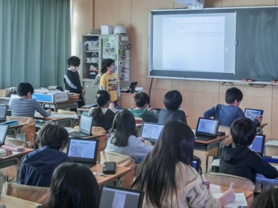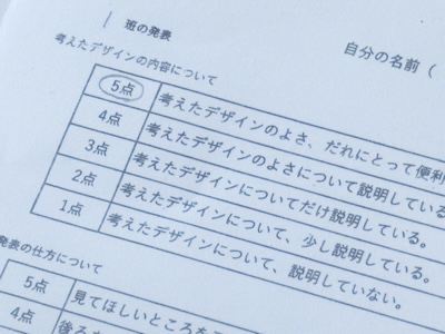 グループごとに、発表の良かったことについて、聞いている子どもたちが採点していました。