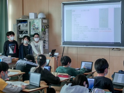 ユニバーサルデザインに配慮したテレビのリモコンを考えました。発表原稿をタブレットで作成して、練習しました。