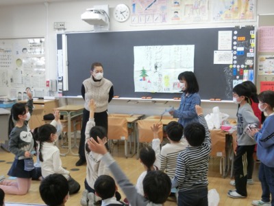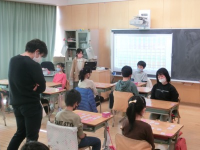 2-2は、お楽しみ会をしていました。魚つりゲームで盛り上がっていました。