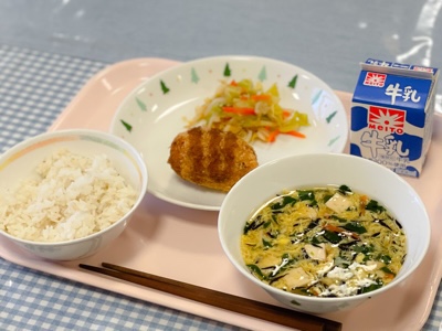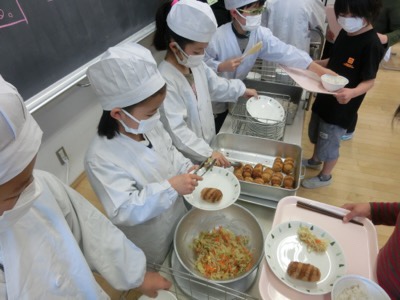 3-1の子どもたちは、「いただきます」の挨拶をしてすぐに、コロッケの中を確かめていました。希望の中身が出て静かにガッツポーズをしている子もいました。楽しい給食のために、栄養士や調理員のみなさんが工夫して献立を考えています。