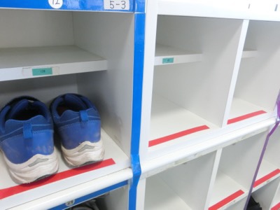 美化委員会の子どもたちが、全校の靴箱に赤いビニールテープを貼ってかかとを揃えるように呼びかけました。