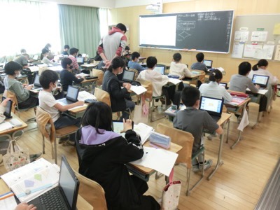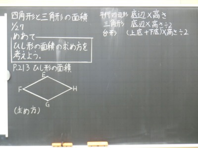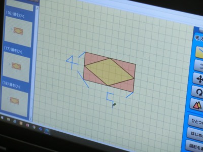 今日は5-1の算数から。四角形の面積の学習で、ひし形の面積の求め方を考えています。