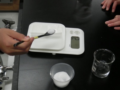 薬品を電子上皿ばかりで計りとり、溶かして水溶液を作ります。