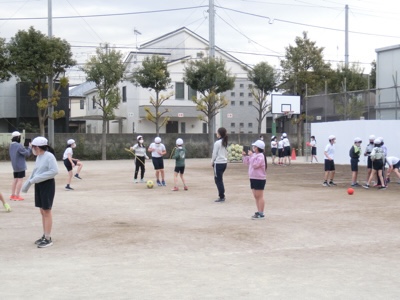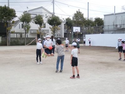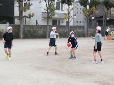 4-2の体育は、ボールを持って大縄を跳んでいました。