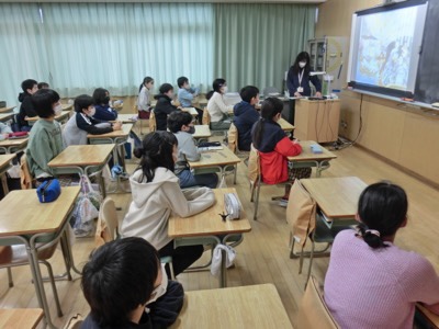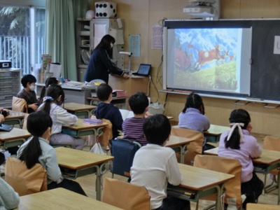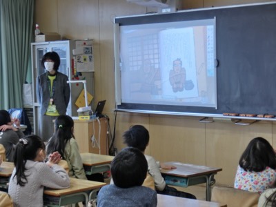 3-3には山内副校長先生が登場。「ばけものつかい」という楽しいお話を読んでくれました。いろいろな先生が本を読んでくれる「ハッピーブックタイム」。読書の楽しさを広げていく天沼小独自の取り組みです。