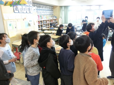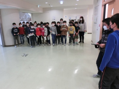 プログラミングクラブのドローンを見て、やりたそうな3年生たち。