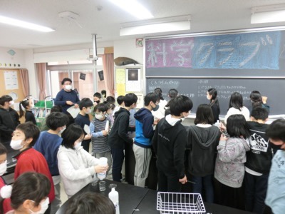 科学クラブではスライム作りを見学。クラブ数がたくさんあるので、1つのクラブで2分間しか見られないのが残念です。