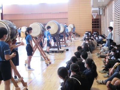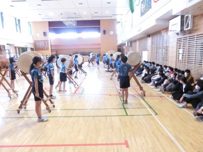 アリーナでは、天沼伝の太鼓の引き継ぎが行われました。藍染Tシャツを着た5年生が、練習の成果を6年生に聴かせました。