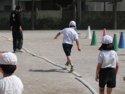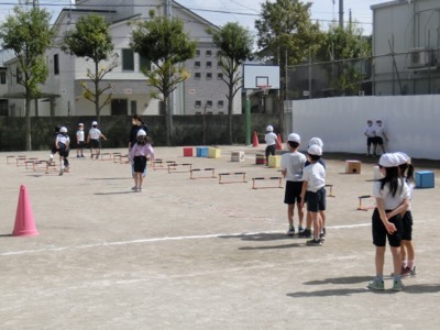 校庭では1-1と1-5が体育をしていました。ミニハードルやコーンを並べて、跳び越えたり回ったりしながら走っています。