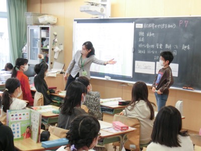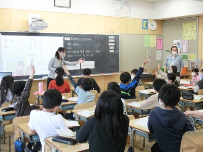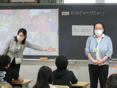 今日は、英語での自己紹介の仕方を学習しました。高学年の英語を担当するのは、山藤先生。JTE(日本人英語指導助手)の原田先生と一緒に教えます。