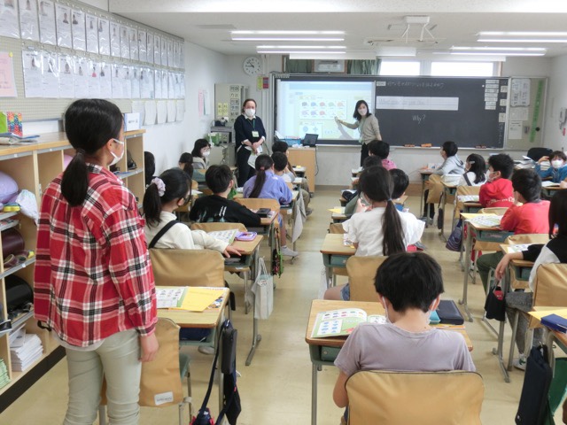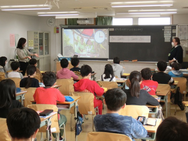学年が上がるにつれ、担任の先生以外の授業が増えてきます。高学年の英語は講師の山藤先生。これは5-2です。