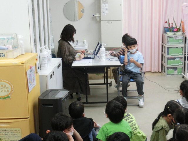 授業ではありませんが、保健室では養護教諭の大浦先生が1-4の子どもたちの聴力検査をしていました。