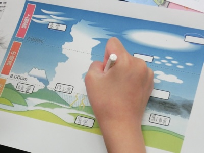 ワークシートに雲の名前を書き込んでいます。