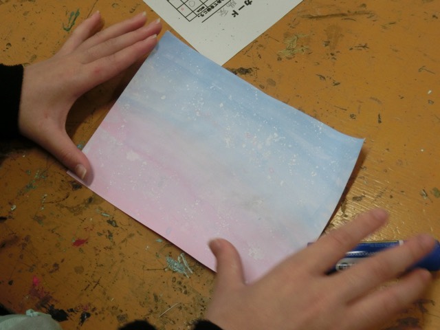 小さめの画用紙に模様を描いて、どんな気持ちを表しているのかカードの裏に書きました。