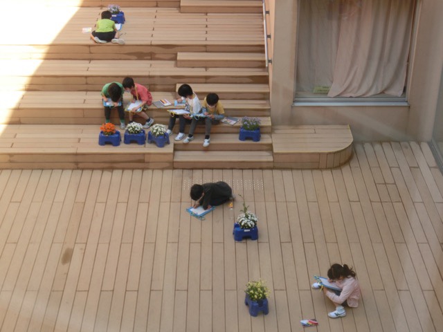 風のテラスでは2-3の子どもたちが鉢植えのビオラの観察をしています。