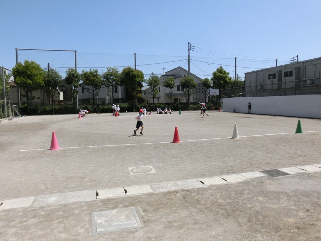 今日は初夏のような天気です。校庭では4-2が折り返しリレーをしていました。
