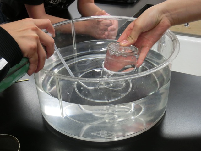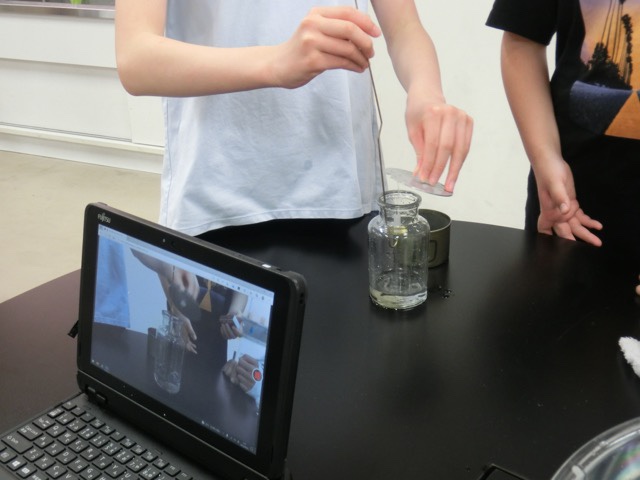 その中に、火のついたロウソクを入れる実験です。入れるところをタブレットのカメラで動画撮影をしているところが昔と違うところですね。