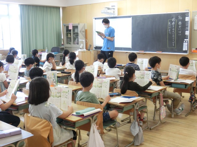 2-1の国語の授業です。「春がいっぱい」を読んで、春の動植物に関する言葉を探していました。いい姿勢で音読していますね。