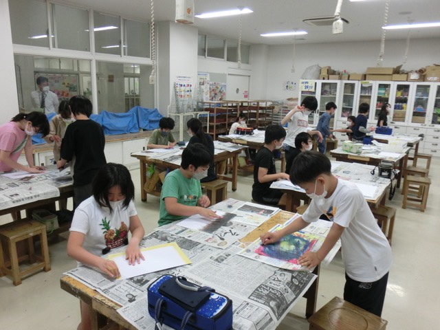 図工室では6-3が「自分の気持ちを絵の具やパステルで表す」という活動をしていました。