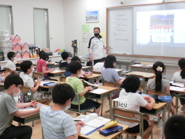 校庭が工事の期間、5・6年生は天沼中学校のグラウンドを借りて体育をしています。今日は6年生が天沼中で体育をしていました。青空の下、広々とした校庭で直線50mを走るのは気持ちよさそうです。