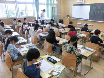 1-1は図工です。ゴールデンウィークの思い出を描きましょうという先生の説明を聞いています。わずか1か月なのに、こんなにしっかり話が聞けて立派です。