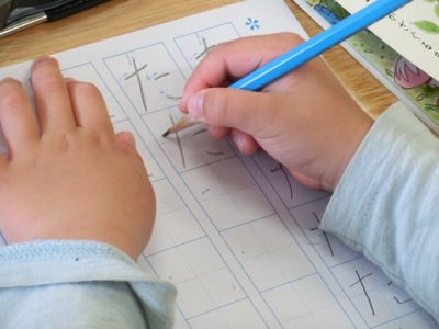 なぞり書きをして形をしっかり覚えてからマス目に書いていきます。