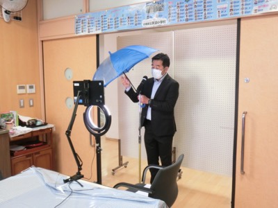 お天気リポーターではありません。中島先生の生活指導のお話です。傘をきちんと畳んで巻くこと、振り回さないことなどを指導しました。
