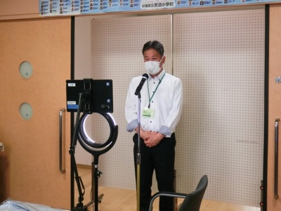 今日は土曜授業です。副校長先生の司会で朝会が始まりました。朝会や集会は、オンラインで教室に配信する方法で行っています。