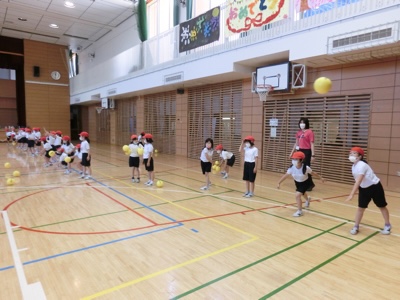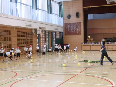 今日は1年生中心に見ていきましょう。アリーナで1-1と1-2が体育をしていました。たくさん投げることで、ボールを投げる動きを身につけさせようとしています。