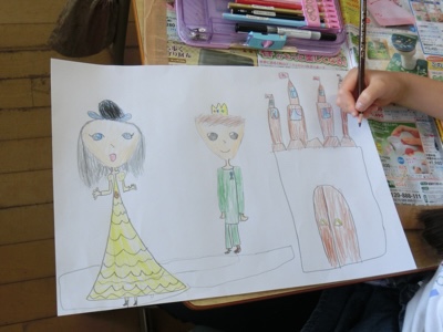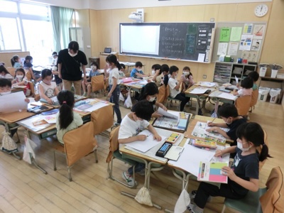後ろで見ていたら、何人もの子が「校長先生、見て〜」と言いながら作品を見せてくれました。