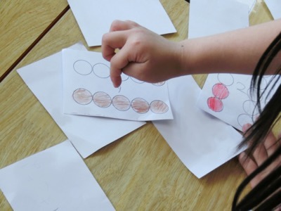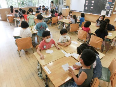 1-3は算数です。数字を丸の数で表したカードを伏せて、トランプの神経衰弱のようなゲームをしていました。