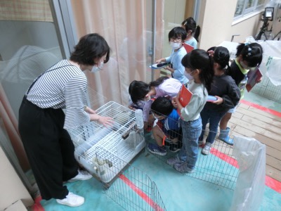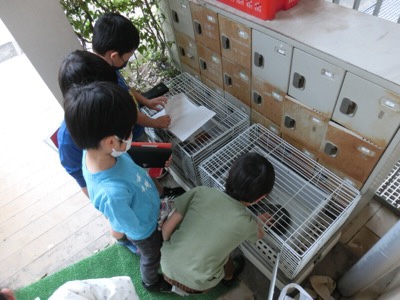 2-2が国語の学習「かんさつ名人になろう」で、天沼小の飼育動物を観察してメモを取っていました。みなさん、天沼小の飼育動物をご存知ですか?工事中の現在、家庭科室の外のテラスにウサギが2匹います。