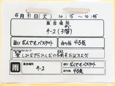 今日の集合場所の活動内容が掲示板に貼られています。この班は「なんでもバスケット」をやるようです。