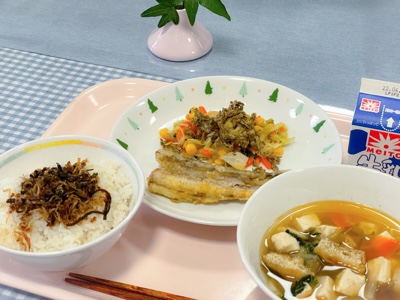 「ニギスの唐揚げ」は、中骨や小骨もカミカミして食べます。ごはんに載っている「かみかみふりかけ」は硬めのちりめんじゃこと塩昆布と鰹節、サラダの上にはごぼうのかりかり揚げ。よく噛むことで、肥満防止や消化促進、口や歯の健康にもつながるので、普段からよくかみかみして食べましょう。