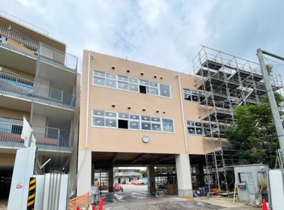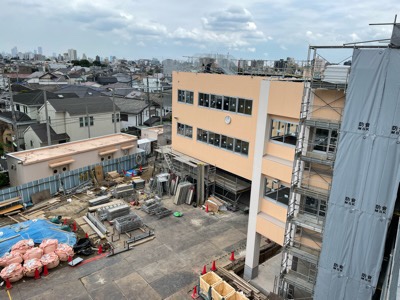 南門側から見たところです。今後2か月かけて、内装工事や門などの外構工事を進めていきます。増築校舎自体の完成は8月の半ばになる予定です。