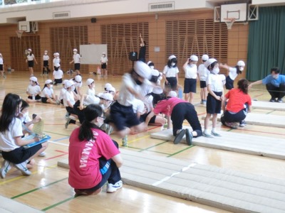 これは、瞬発力・跳躍力を調べる「立ち幅跳び」です。どの種目も、学校支援本部(AW)のみなさんが並ばせたり誘導したりやり方の指導をしたりと、計測のサポートをしてくれています。