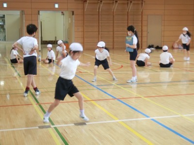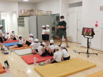 これは、筋力・筋持久力を調べる「上体起こし」です。今年度は校庭が狭く距離が取れないため、「50m走」と「ソフトボール投げ」については実施しません。(5・6年生は天沼中校庭の使用タイミングが合えば実施します)