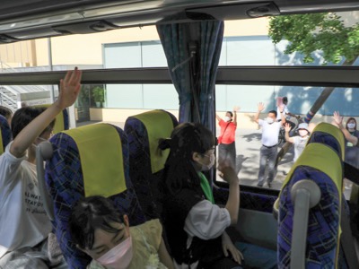 定刻通り、7時30分にバスが発車しました。お見送りの方々が手を振ってくれました。それでは3日間、行ってきます。