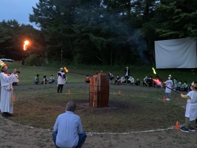 初日のレクリエーションはキャンプファイヤーです。どこからともなく現れた(笑)火の神が、火の精に火を授けました。