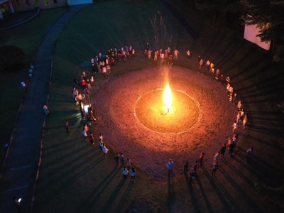キャンプファイヤーの様子をドローンで空撮しました。※国土交通省に飛行計画を提出し、土地管理者の富士学園に許諾を得た上で飛行しています。
