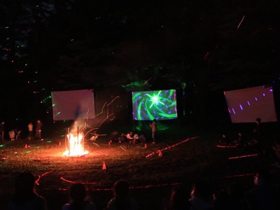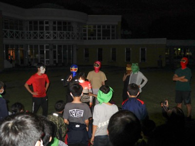 まだ外は明るいのですが、キャンプファイヤーが燃え上がると夜らしくなってきます。この周りで、ゲームをしたりダンスをしたり盛り上がりました。