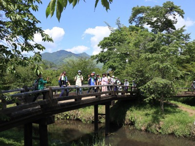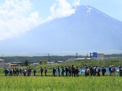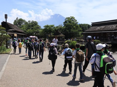 帰りはバスに乗らず、忍野八海を通って富士学園に戻ります。雄大な富士山を見ながら畑の中を歩きました。気持ちよい風が吹いていました。