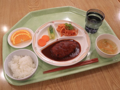 今日のメニューは、ハンバーグ、野菜スープ、ごはんでした。