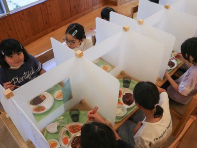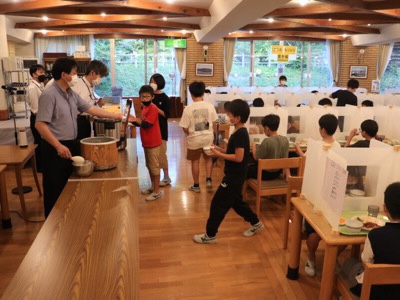 富士学園2日目の夕食です。食事係が配膳と挨拶をします。