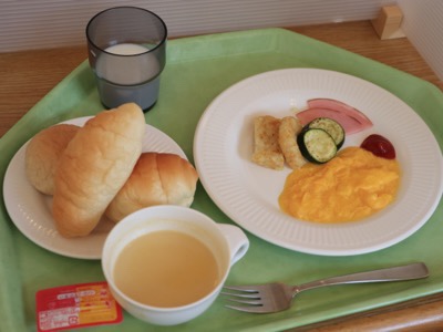 今朝のメニューは、パンとコーンスープ、スクランブルエッグなどです。パンが多いと思う子は予め減らすことができます。